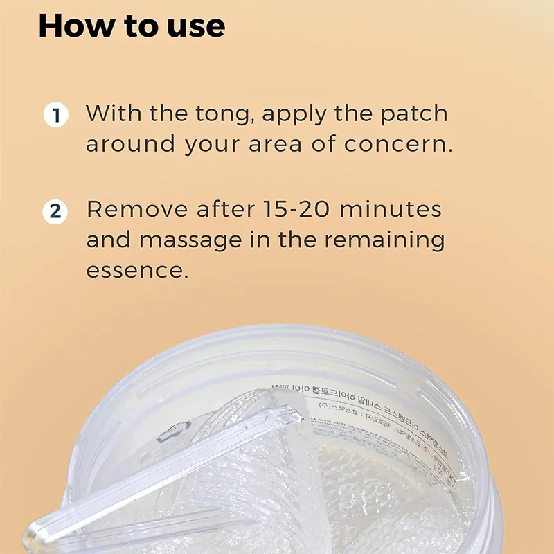 Po odos valymo ir tonizavimo, specialia mentele (jei yra) išimkite pagalvėles iš pakuotės. Uždėkite jas ant švarios paakių odos (platiąją dalį plačiajai paakių sričiai, siaurąją – arčiau nosies). Palikite 15-20 minučių. Nuėmus pagalvėles, švelniai įtapšnokite likusią esenciją į odą, kol ji visiškai įsigers. Nenuplaukite. Rekomenduojama naudoti 2-3 kartus per savaitę arba pagal poreikį.
