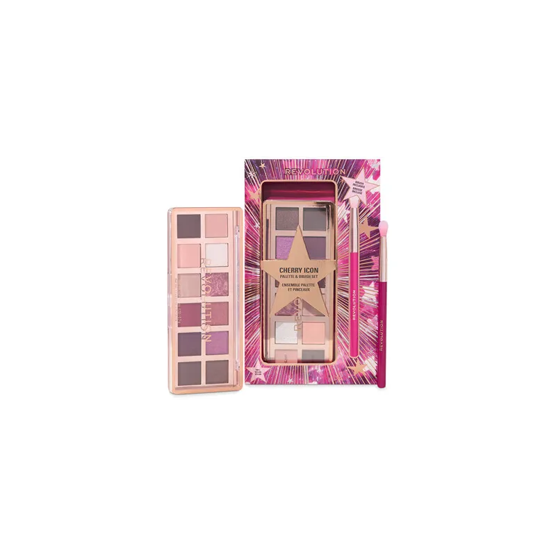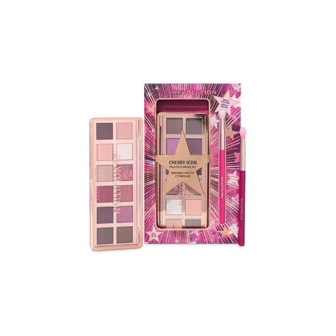 Makeup Revolution Cherie Icon Eye Shadow Palette and Brush Set – tai akių makiažo rinkinys su romantiškų, „cherry“ įkvėptų atspalvių palete ir pridedamu šepetėliu, skirtas tiek kasdieniams, tiek ryškesniems akių įvaizdžiams kurti.
