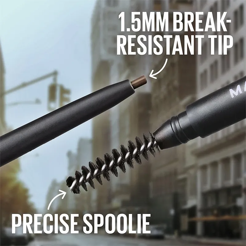 - Itin plonas galiukas (1.5 mm): Svarbiausias pieštuko privalumas – ypač plonas galiukas, leidžiantis imituoti plaukelius ir tiksliai nupiešti norimą antakių formą. Tai suteikia natūralumo įspūdį ir leidžia preciziškai užpildyti retas vietas.