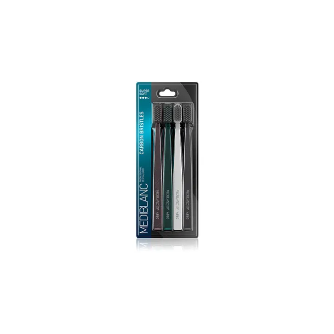MEDIBLANC Toothbrush with carbon bristles – tai keturių dantų šepetėlių rinkinys, sukurtas kasdienei burnos higienai, derinantis švelnų valymą su efektyviu apnašų šalinimu. Anglies (carbon) šereliai padeda palaikyti švaresnę burnos aplinką ir suteikia gaivos pojūtį.