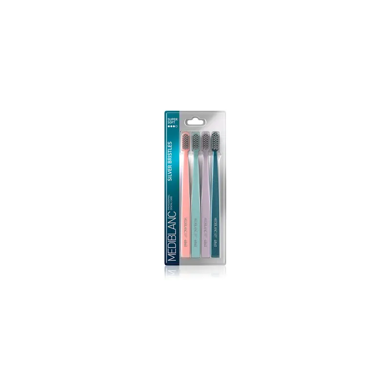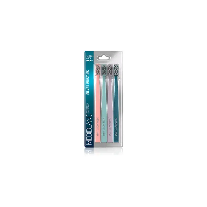 MEDIBLANC Toothbrush with silver bristles – tai keturių dantų šepetėlių rinkinys, sukurtas kasdienei burnos higienai, užtikrinantis švelnų, bet efektyvų dantų valymą. Sidabro jonais praturtinti šereliai padeda palaikyti higienišką švarą ir sumažinti bakterijų kaupimąsi burnos ertmėje.