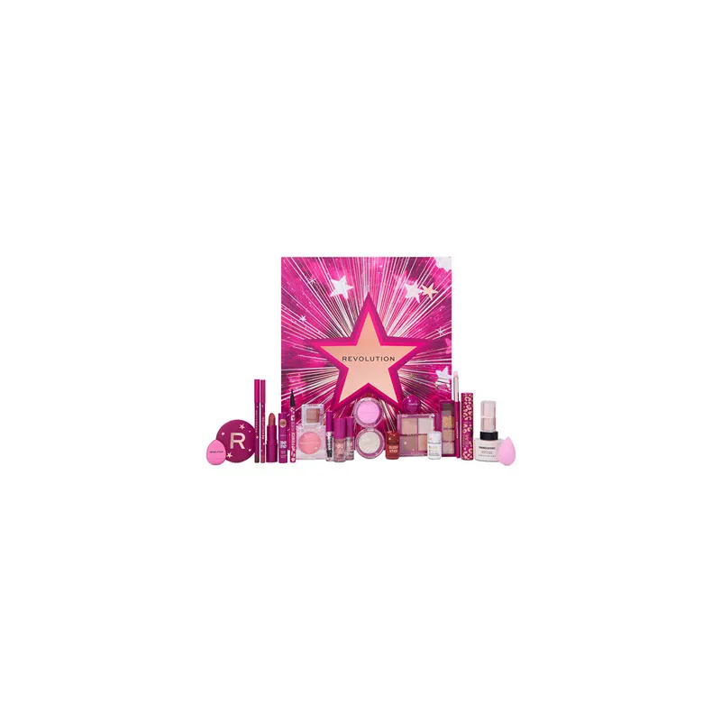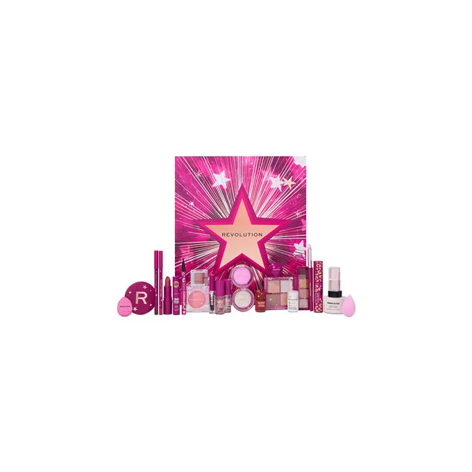 Makeup Revolution Beauty Star Makeup Advent Calendar – tai 24 dienų grožio advento kalendorius, kuriame pateikiamas pilnas makiažo rinkinys su mini ir pilno dydžio produktais, skirtas kasdieniam makiažui nuo veido iki lūpų ir akių.