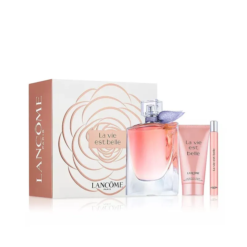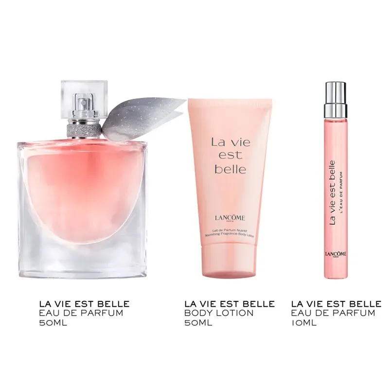 Atraskite džiaugsmingą ir spinduliuojantį Lancôme La Vie Est Belle dovanų rinkinį. Šis populiarus rinkinys skirtas moteriai, kuri vertina gyvenimo grožį ir laimę. Jį sudaro 50 ml talpos parfumuotas vanduo (EDP), 50 ml talpos švelnus kūno losjonas ir patogi 10 ml talpos miniatiūrinė EDP versija.