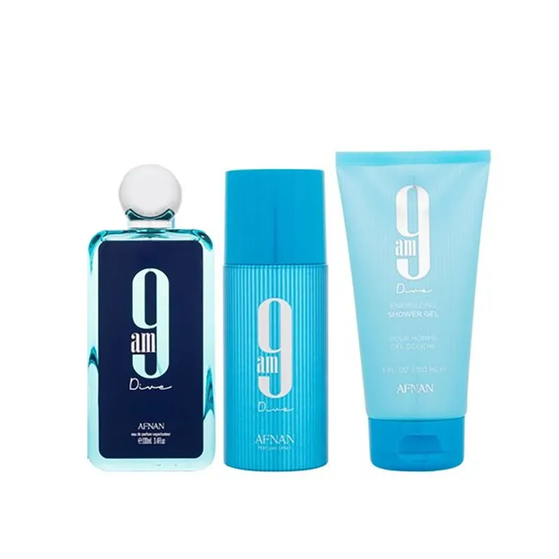 „Afnan 9 AM Dive“ – tai energingas, gaivus ir jūrinis kvapas, sukurtas asmenybei, kuri mėgsta nuotykius ir laisvės pojūtį. Aromatas alsuoja citrusų ir vandens natomis, kurios atsiskleidžia švariai ir gyvybingai, idealiai tinka šiltoms dienoms ar aktyviam gyvenimo būdui. Dovanų rinkinys apima visapusišką kvapo patirtį – nuo ryto prausimosi iki visos dienos gaivos.