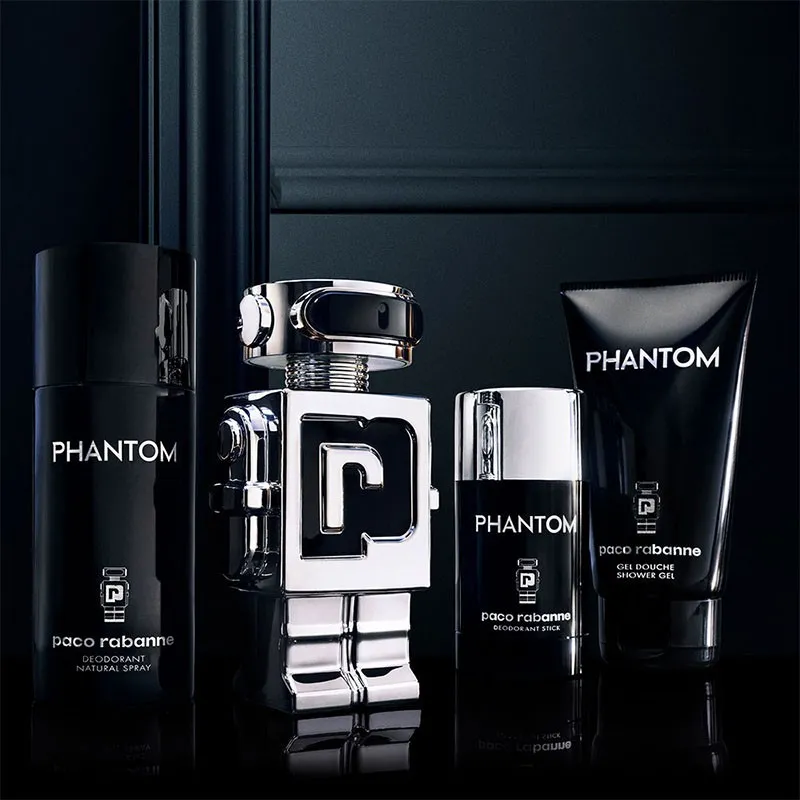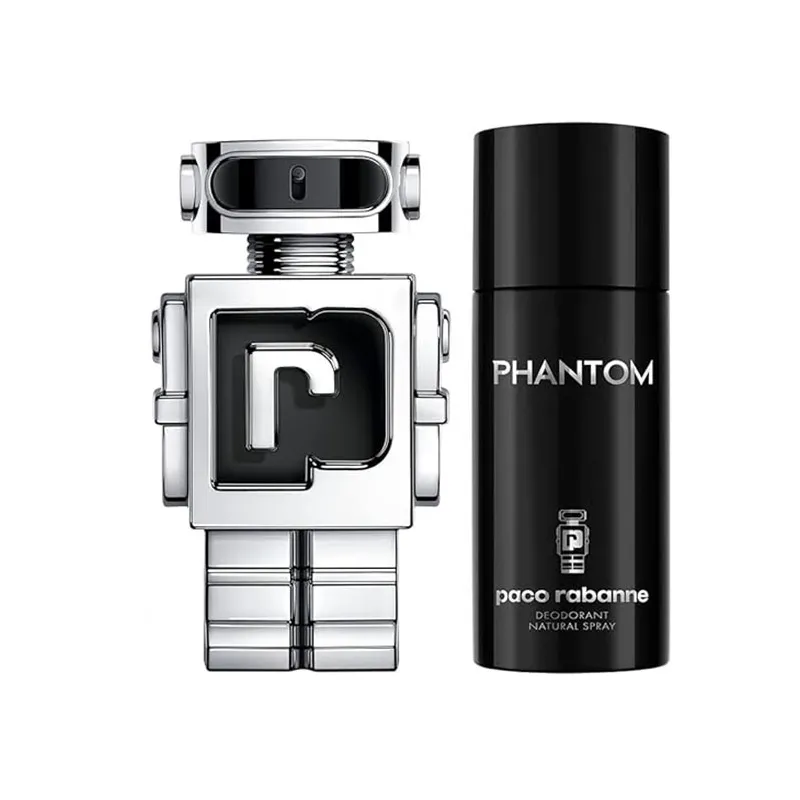 Phantom dovanų rinkinys – tai gaivus ir modernus aromato ritualas vyrams: butelis su pažangiu robotizuotu dizainu ir sutoniodami deodorantas, pratęsiantis kvapo patirtį visą dienos dalį.