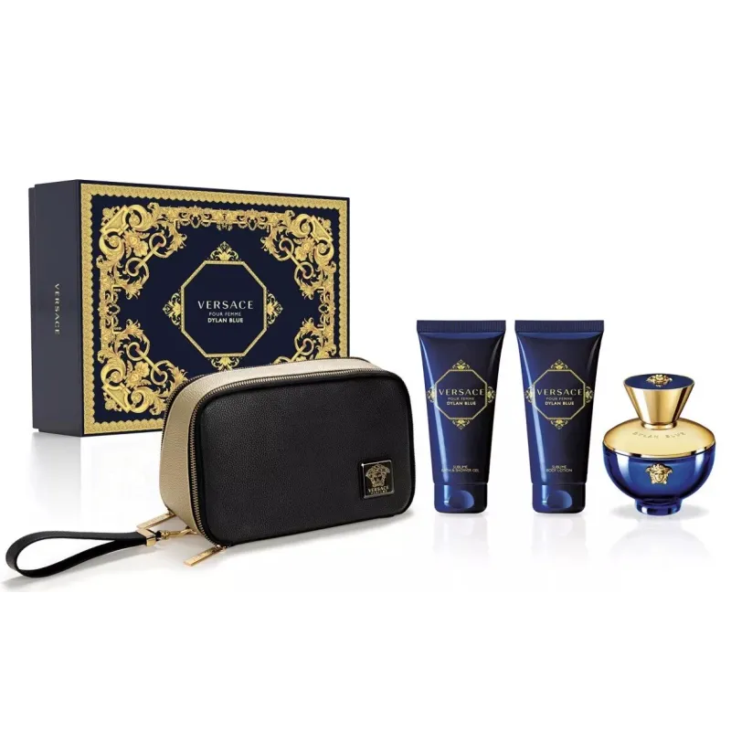 Versace Dylan Blue pour Femme rinkinys EDP 100 ml, kūno losjonas 100 ml, dušo želė 100 ml ir kosmetinė moterims