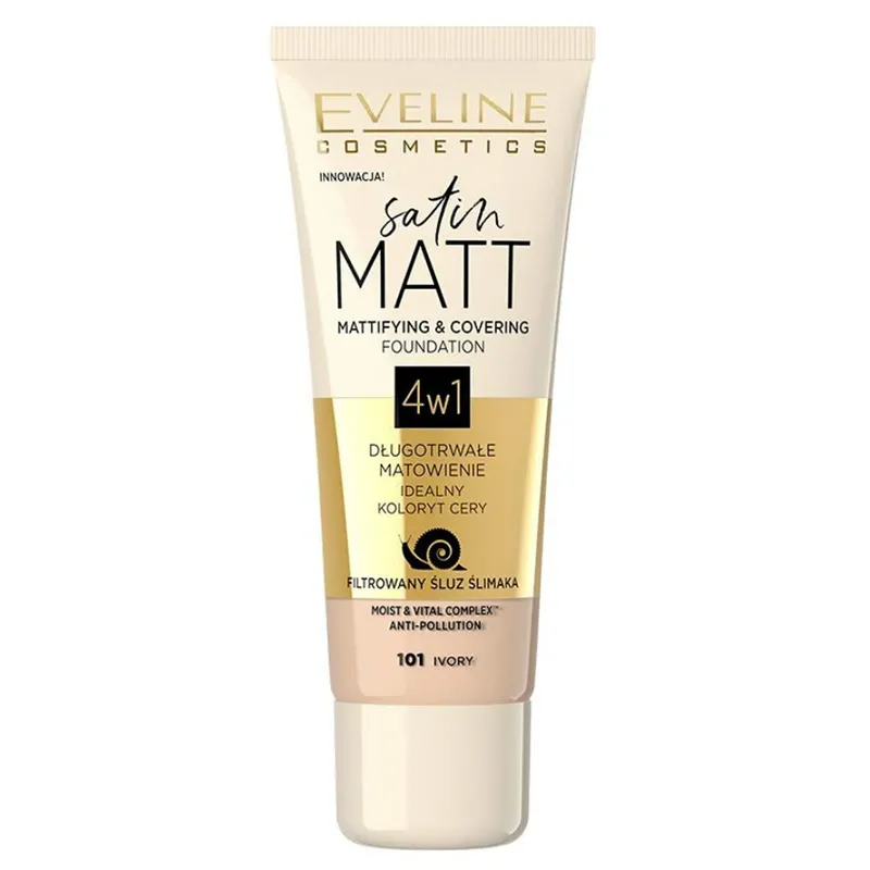 Eveline Cosmetics Satin Matt Mattifying & Covering Foundation 4in1 - makiažo pagrindas su matiniu efektu, 30 ml - 101 Ivory