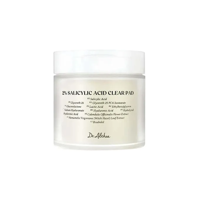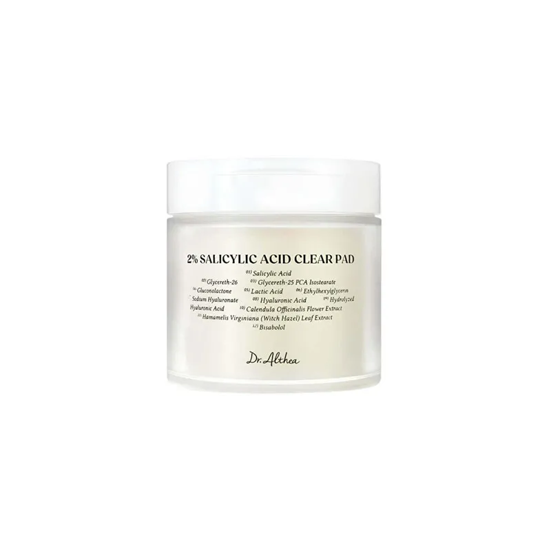 Dr. Althea 2% Salicylic Acid Clear Pad – tai aktyvūs eksfoliuojantys toniko diskeliai, skirti porų valymui, spuogų mažinimui ir odos tekstūros gerinimui, kartu palaikant drėgmės balansą.