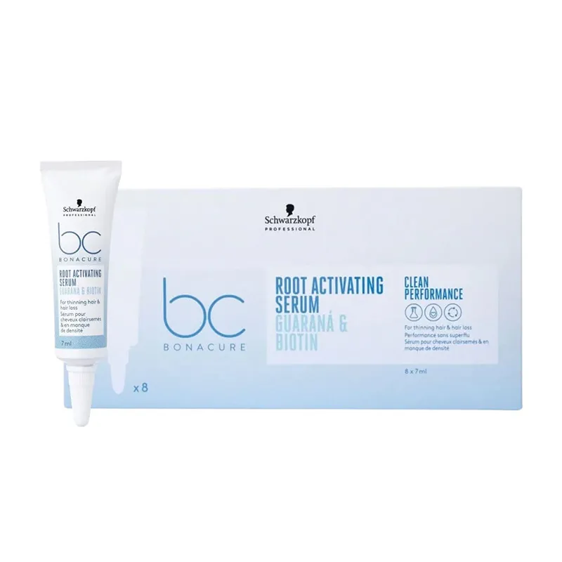 „Schwarzkopf Professional BC Bonacure Root Activating Serum“ – tai intensyvaus poveikio kursas, skirtas silpniems ir retėjantiems plaukams stiprinti. Šis serumas sukurtas aktyvinti plaukų šaknis ir mažinti nepatologinį plaukų slinkimą. Pakuotėje esančios 8 ampulės po 7 ml užtikrina tikslų dozavimą ir koncentruotą poveikį tiesiai į galvos odą, skatinant plaukų tankumą ir gyvybingumą.