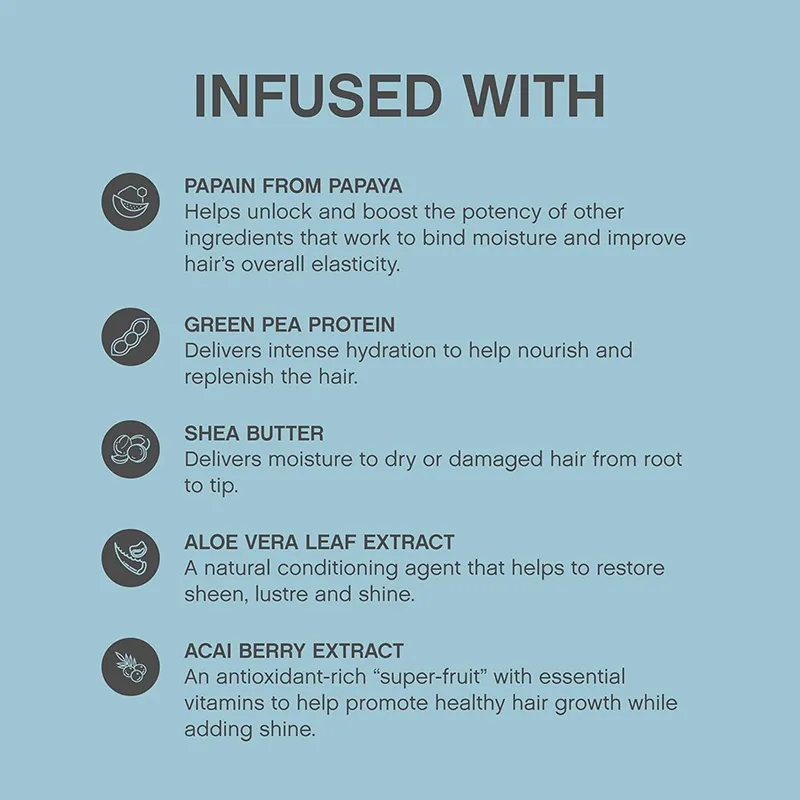- Gilus atkūrimas: Formulė, praturtinta žaliosios žirnių proteinais, veikia plaukų skaidulas, atkuria pažeistas vietas ir sustiprina plaukus iš vidaus, padidindama jų atsparumą.