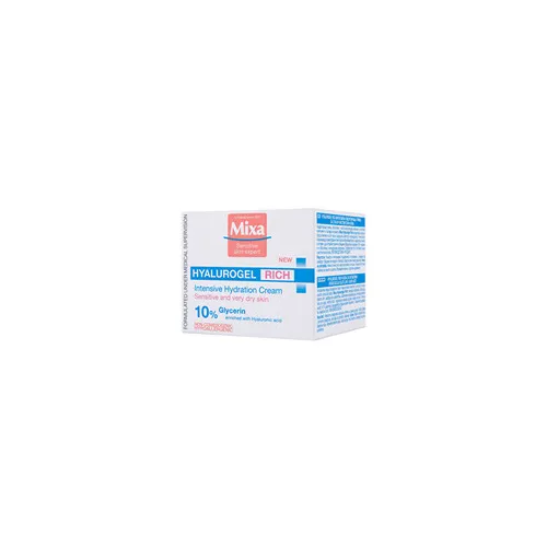 Mixa Intense Hydrating Day Cream (Hyalurogel Rich Cream) yra intensyviai drėkinantis dieninis veido kremas, specialiai sukurtas sausai ir labai sausai, jautriai odai. Šis kremas yra „Mixa“ prekinio ženklo, žinomo dėl savo jautriai odai skirtų, hipoalerginių ir paprastų formulių, dalis. „Hyalurogel Rich Cream“ tikslas – suteikti ilgalaikį drėkinimą, nuraminti odą ir sustiprinti jos apsauginį barjerą, kad ji taptų elastingesnė ir mažiau reaguotų į išorinius dirgiklius.