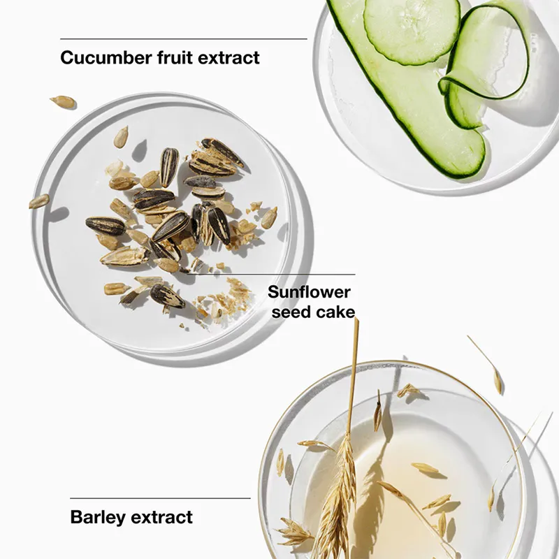 - Saulėgrąžų sėklų pyragas, miežių ir agurkų ekstraktai – šis augalinis kompleksas padeda sustiprinti odos barjerą ir suteikia elastingumo