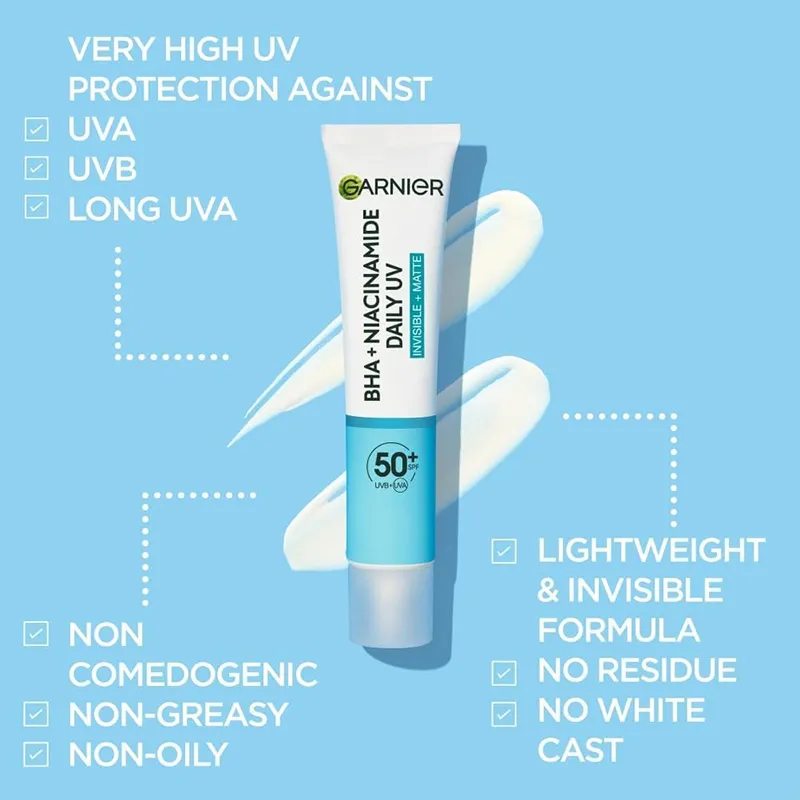 Garnier Pure Active BHA + Niacinamide Daily UV Anti-Imperfection Fluid SPF 50+ – kasdienis apsauginis fluidas, skirtas mišriai, riebiai ir į netobulumus linkusiai veido odai. Lengva, greitai įsigerianti formulė padeda apsaugoti odą nuo UVA ir UVB spindulių, kartu palaikant matinį efektą ir tolygesnę odos išvaizdą.
